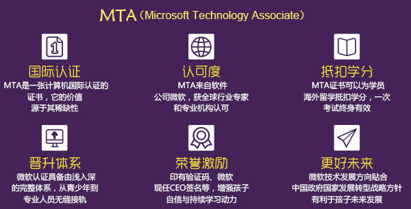 MTA(Microsoft Technology Associate)中文为微软技术专员认证。MTA是IT应用人才专业认证,是迈向微软认可的技术专家的第一步。获得微软技术平台初步实际的操作经验,并通过MTA国际认证后,可以继续努力往中高级及架构级的认证之路前进(MCSA及MCSD)。 考取MTA可以提高孩子们学习兴趣,由浅入深,从K12到专业无缝接轨,一条龙式的学习架构。